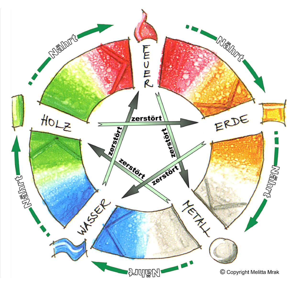 Besonders wichtig ist ein ausgeglichener persönlicher Elementekreislauf. Fehlende Elemente können in Ihrer Umgebung durch Gestaltung, Form, Farbe, Materialien ausgeglichen werden. Ist Ihr persönliches Element zu schwach, muss dies gestärkt werden.